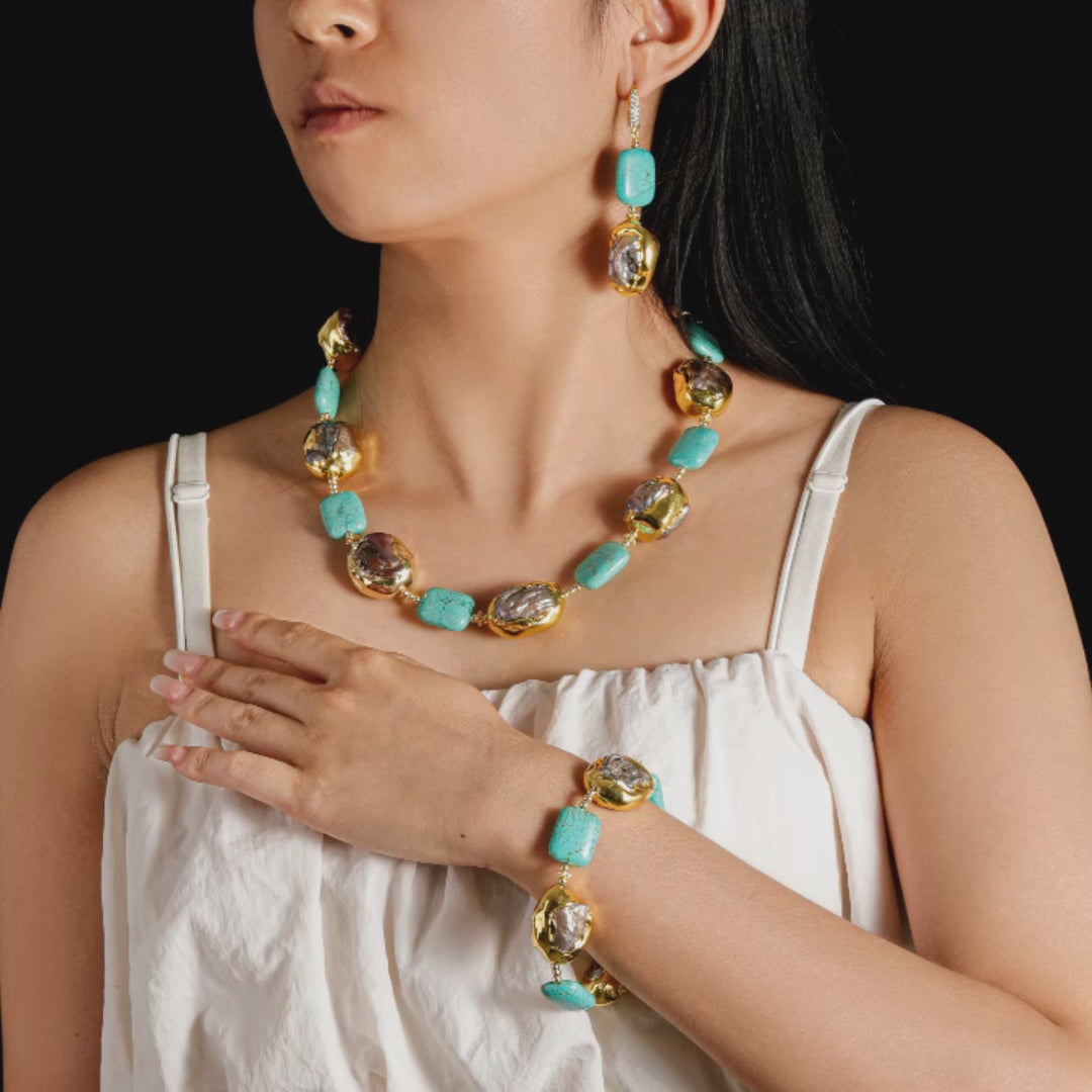 Eine lebendige Fusion aus türkisfarbenen Steinen und geschmolzenen goldfarbenen Fassungen, diese Halskette bringt kühne Kunstfertigkeit in Ihren Look. Ihre organischen Formen und schimmernden Akzente schaffen ein auffälliges Statement-Stück für jeden, der sich zu lebendiger, kreativer Eleganz hingezogen fühlt.