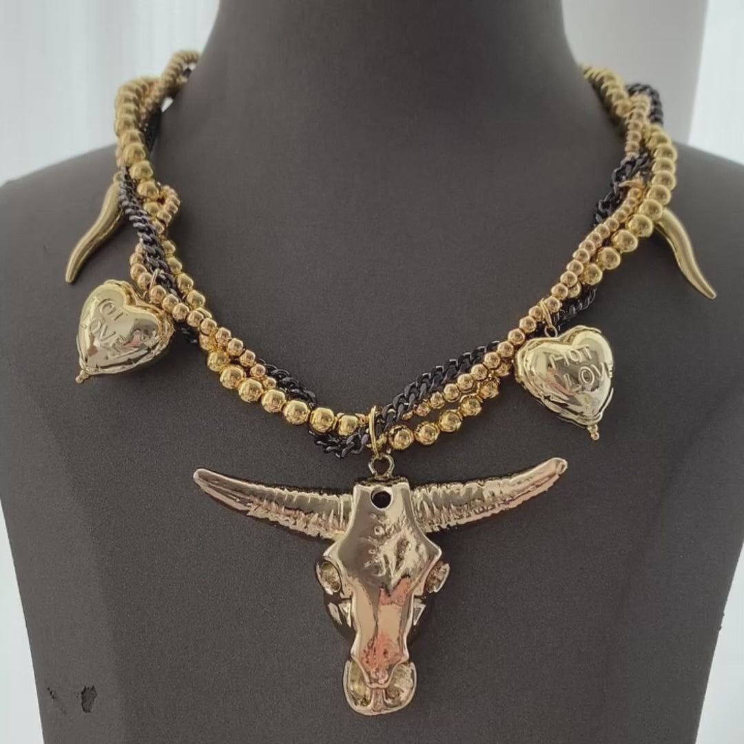 Die Relic Heart Halskette verbindet Vintage-Charme mit modernem Prunk. Geschmückt mit kunstvollen Anhängern und kräftigen goldenen Details erzählt sie eine Geschichte von Hingabe und Stärke—gefertigt für diejenigen, die ihr Selbstbewusstsein wie einen Schatz tragen.