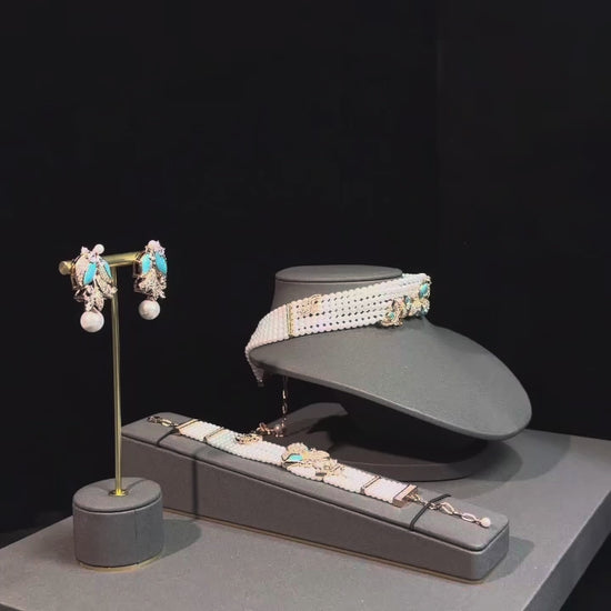 Azure Fleur Pearl Necklace blends luminous pearl strands with delicate floral motifs in serene blue tones. Gracefully accented with shimmering stones, it captures refined elegance and fresh sophistication, perfect for elevating bridal looks or evening ensembles.