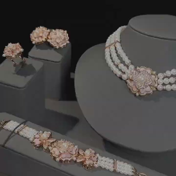 The Blush Bloom Pearl Necklace radiates timeless romance with its triple-strand pearls and floral centerpiece of pink enamel, crystals, and a luminous pearl. A graceful design that embodies femininity, elegance, and refined charm for special occasions.