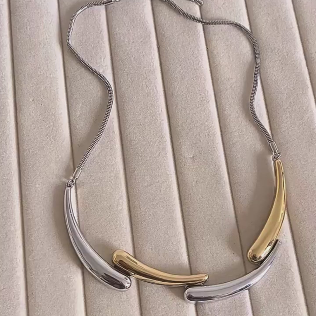 The Dual Aura Collar Necklace curves gracefully along the neckline, blending two radiant tones in one striking silhouette. Sleek yet bold, it delivers modern elegance with a confident twist—proof that when opposites attract, they create pure style chemistry.
