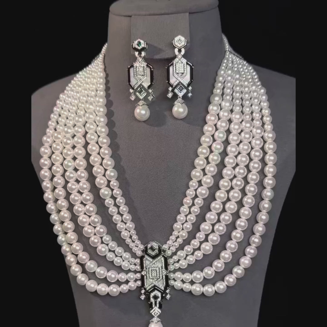 The Duchess Dynasty Necklace exudes royal grandeur with cascading pearls, emerald accents, and intricate silver detailing. Its bold geometric centerpiece channels vintage opulence, making it a statement piece worthy of modern nobility and timeless sophistication.