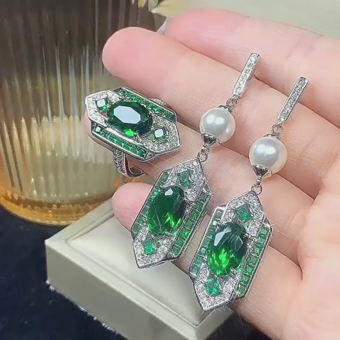 The Emerald Heirloom Statement Earrings are pure old-money glam with a fearless twist. Rich green stones meet luminous pearls in a design that drips confidence. They don’t just complete the look—they crown it. Wear them and let the room adjust accordingly.